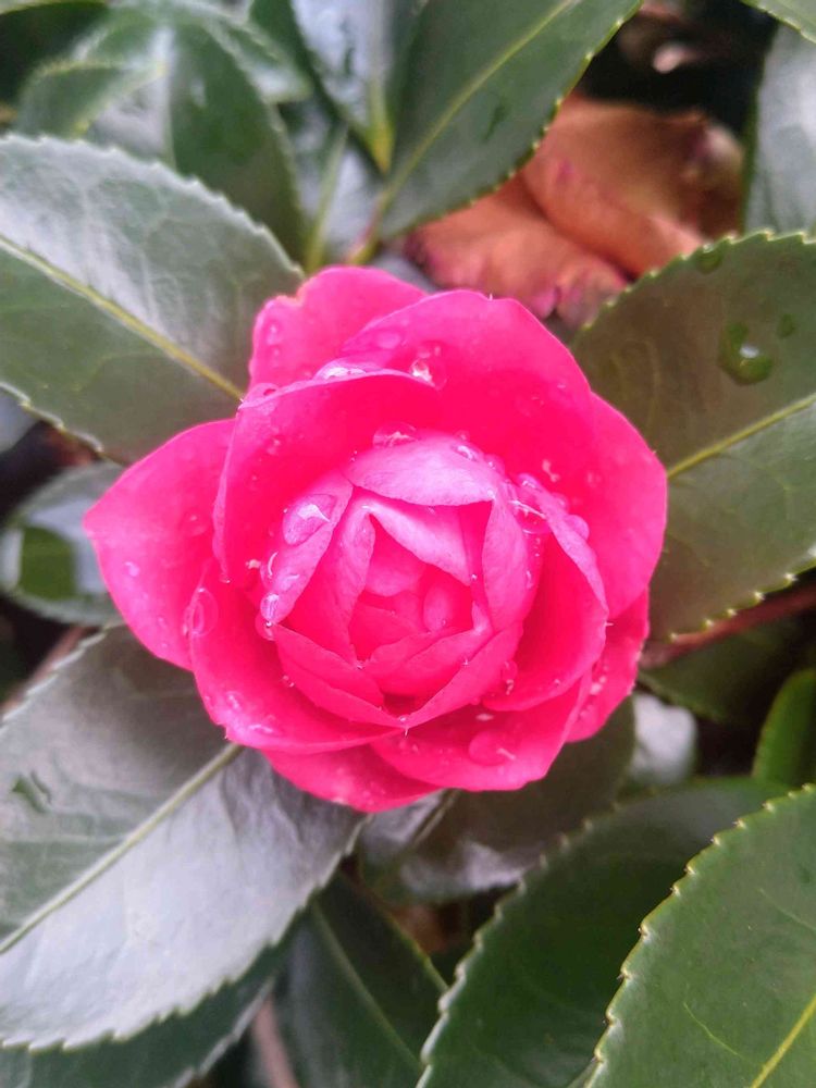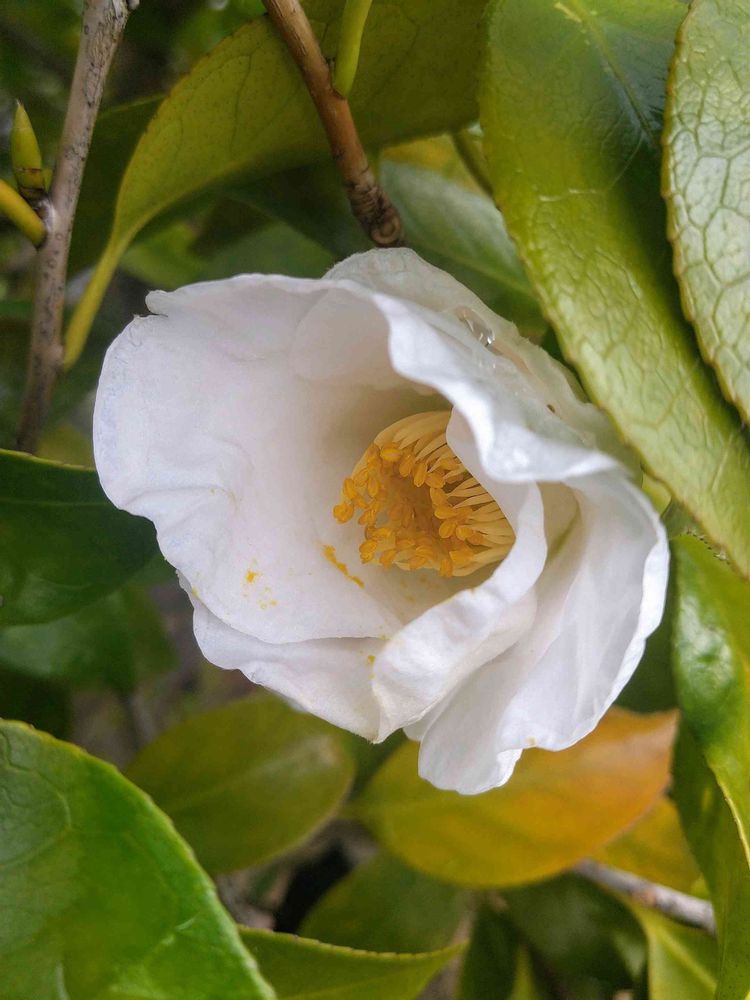 ②ツバキ、元々はピンクの絞りがあったのに、近年は元気がなく、白く小さい花で終わります。