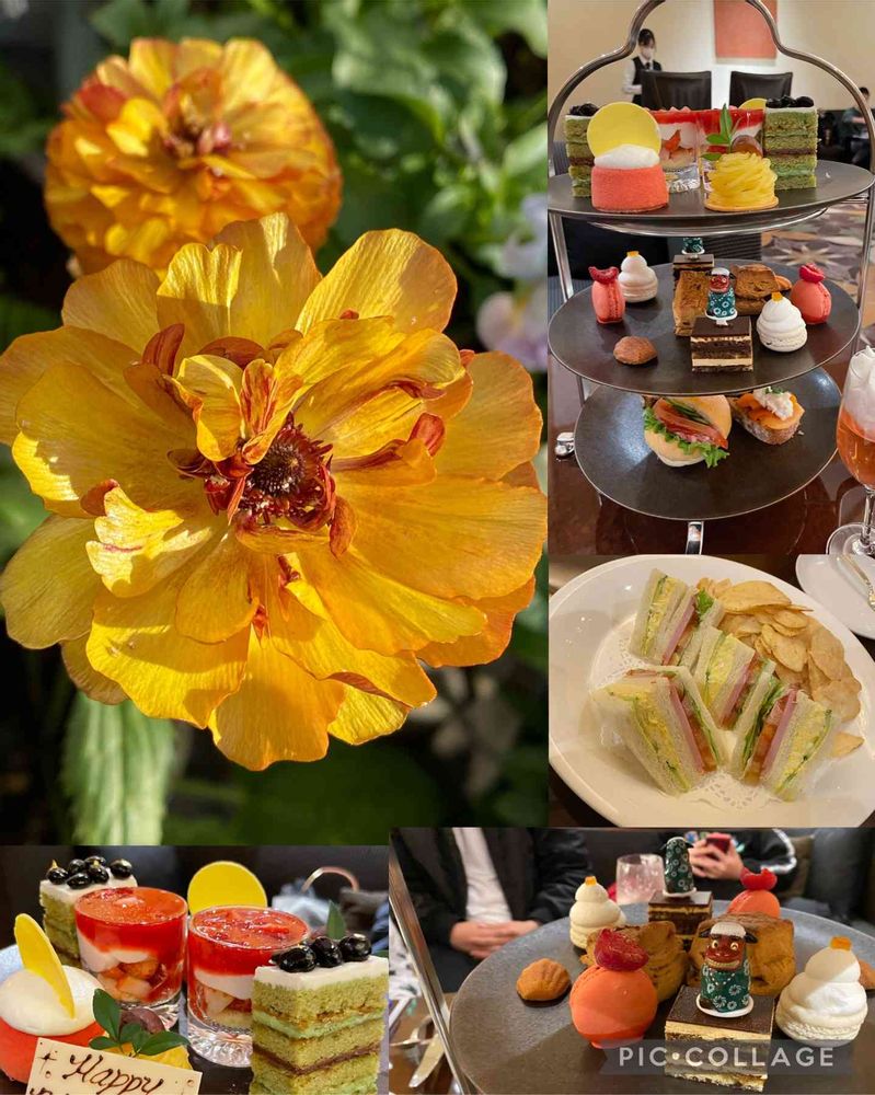 ☘️ラナンキュラスラックス[サティロス]☘️.....今晴れてきて金茶色がピカンと美しいよ💕🌼🫧🫧年末年始を帰省してくれた長女と次男を連れて熊本に行き🚗過ごしました。交通事故で幸いいのちが助かってここに集えたから、次男のお誕生日🎂の前倒しで日航ホテルの[お年賀アフタヌーンティー🫖]をしました。抹茶黒豆やローストビーフのミニバーガーや獅子舞オペラなど並んでいて、孫達も賑やかにお正月気分を味わえました〜😍🎍💕✨🎉