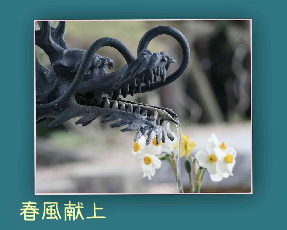 手水舎の龍🐲に水仙さん🧡一枚の絵のようで美しいですね✨