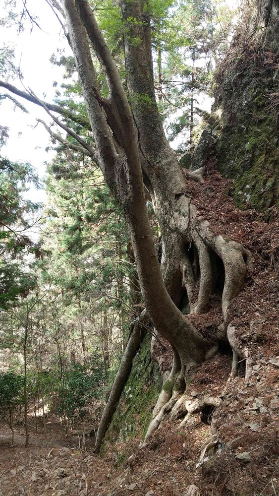 土ない岩壁にへばりつく木、根が幹のように岩の隙間に入り込み生きています。高さ30mほど凄いですね~。😵