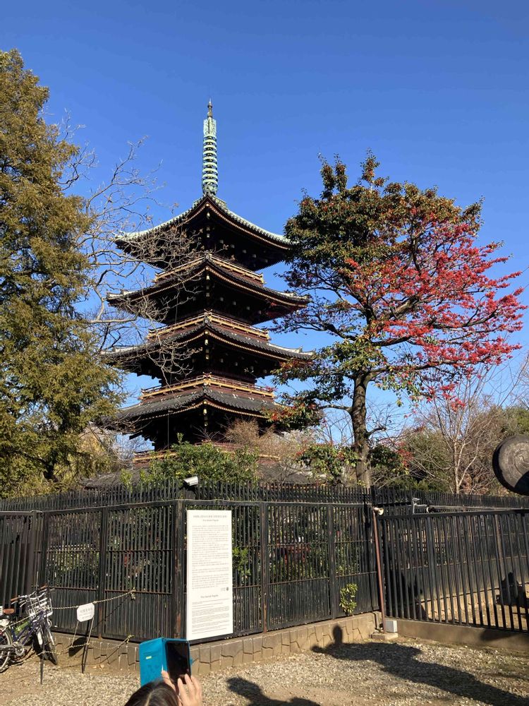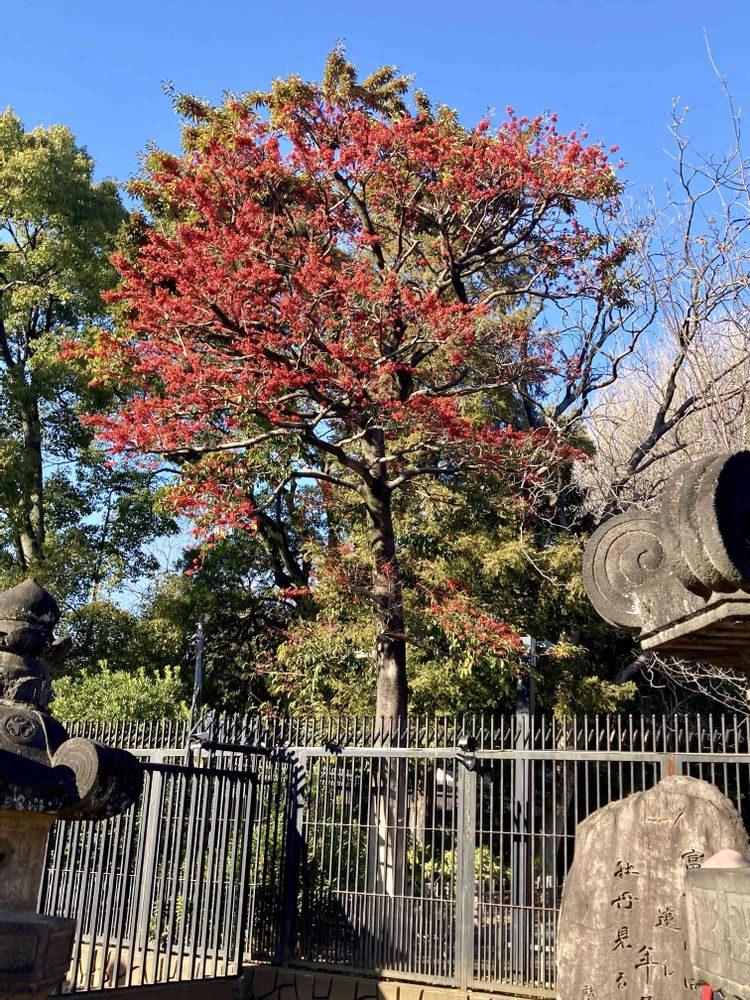 上野東照宮の五重塔の前に生えている赤い実を付けた樹木。多分「モチノキ」だと思うけど、まるで花が咲いているみたいに見える。