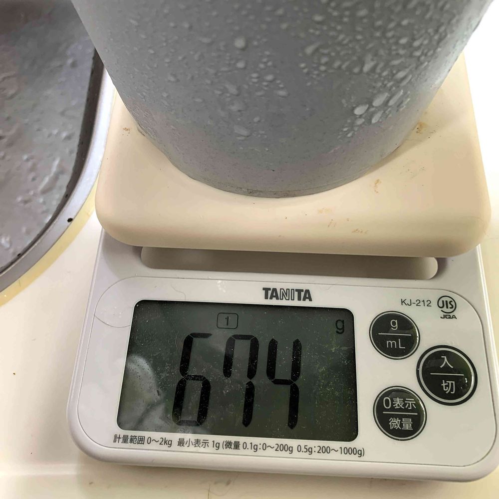鉢底から水が流れ出るくらい水遣りしてから測っています。水遣り前は593gでした。674g になりました。鉢を持ち上げたら確かに重たくなっています。