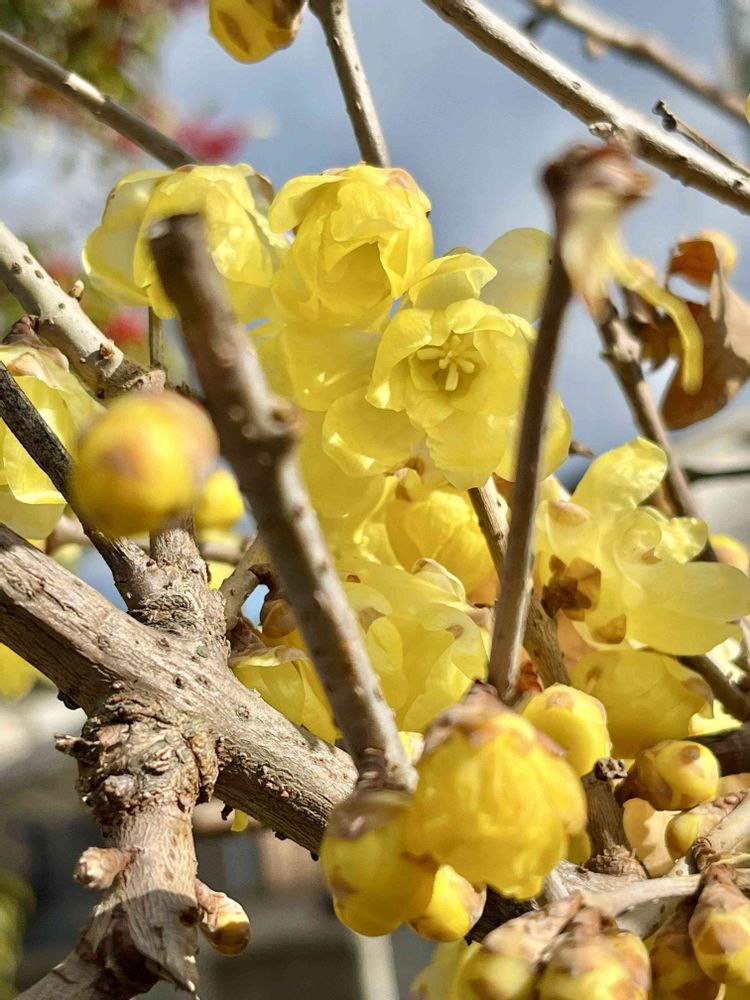こんばんは、蝋梅の黄色と青空。素敵ですね。