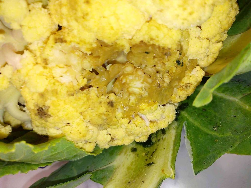 冬季のカリフラワーには霜に当てるのでこういった凍傷になるけど、別段品質に問題なし