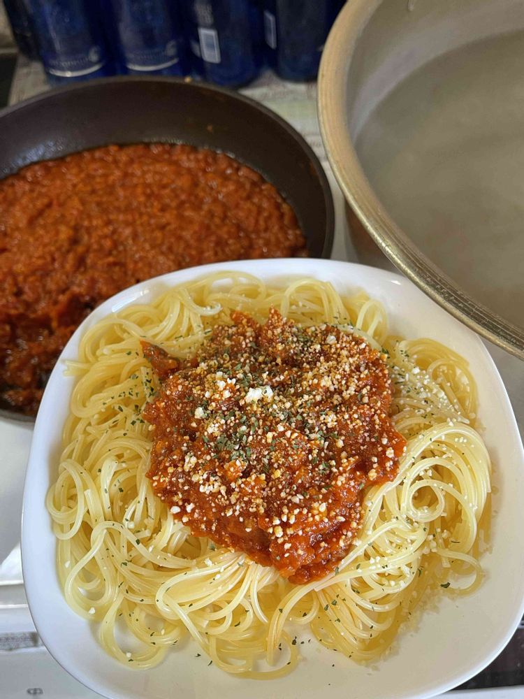 ミートソースの方は人参がメインですがトマト缶も加えて、更にいつもお世話になってる遊歩道のローリエの葉っぱも香りづけに..