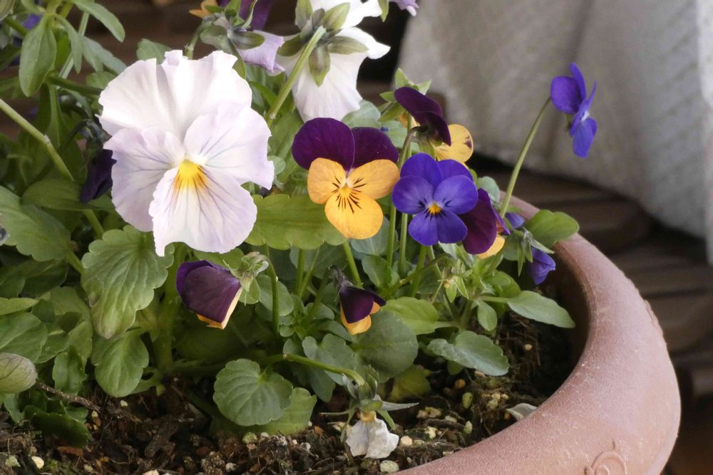 寒さ対策で廊下に避難したビオラの植木鉢。今のところ次々に、咲き始めています。