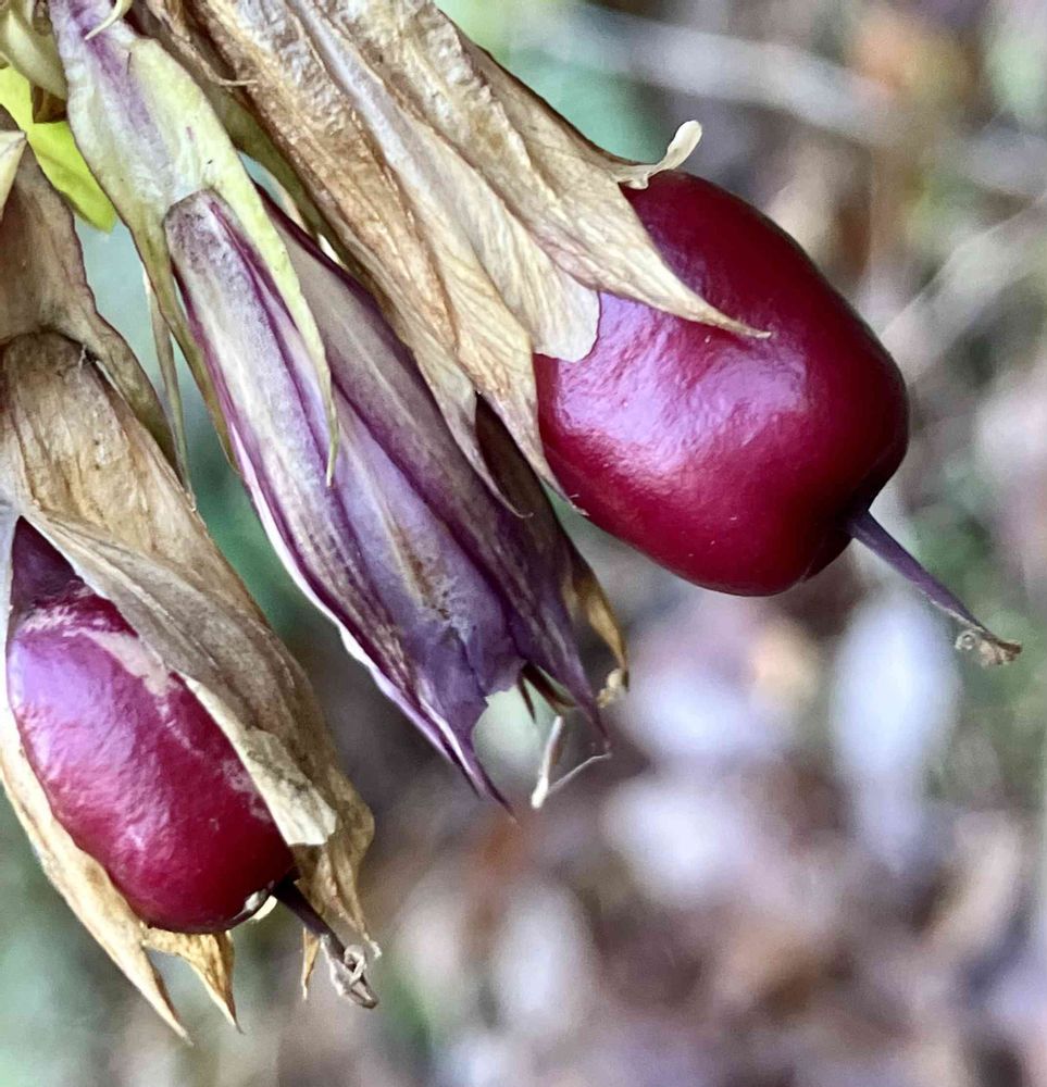 花びらが残ったのと、顔を覗かせたのと、ポッチリした赤い実と、一緒に見られました❣️