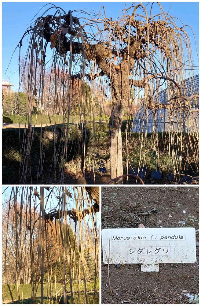 みごとな枝垂れかたです😮😀 葉っぱがないので、よくわかります。シダレグワかぁ🤔 葉っぱがある季節にはどんな姿になるのか楽しみです(農業試験場内にて)