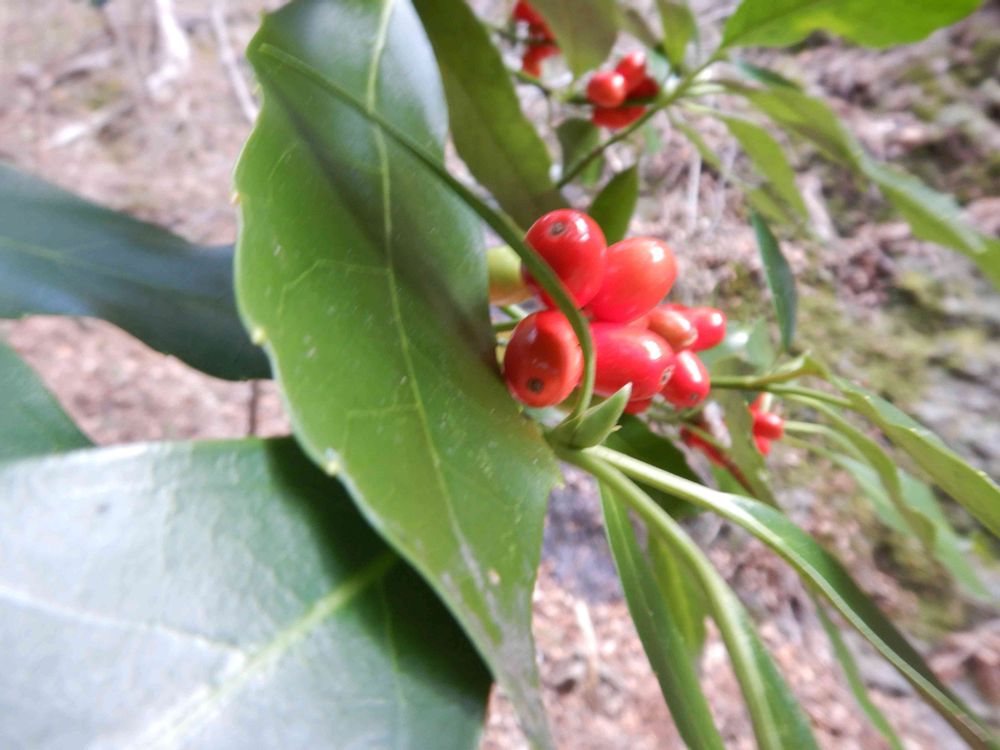 アオキの真っ赤な実が沢山あります。マムシグサも真っ赤。コウヤボウキのドライフラワー。サザンカの🌸🏵花。