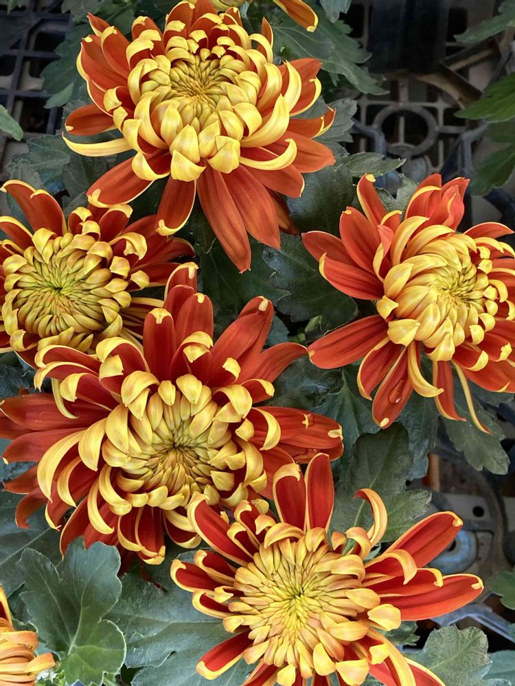黄金色の花弁の内側に赤が入る豪華な配色のキクです。
