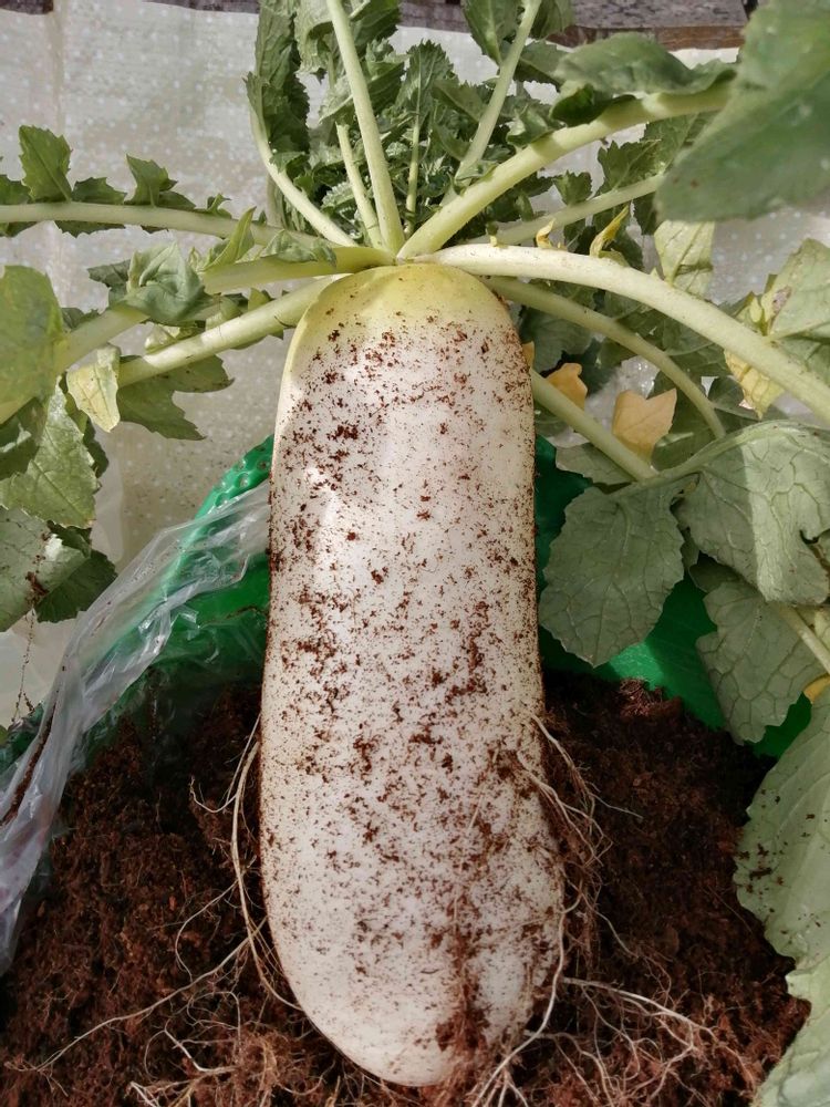 あまり大きくならない大根で、キッチンのポリ袋栽培ですが、思ったより食べられるサイズに育ってくれました😆