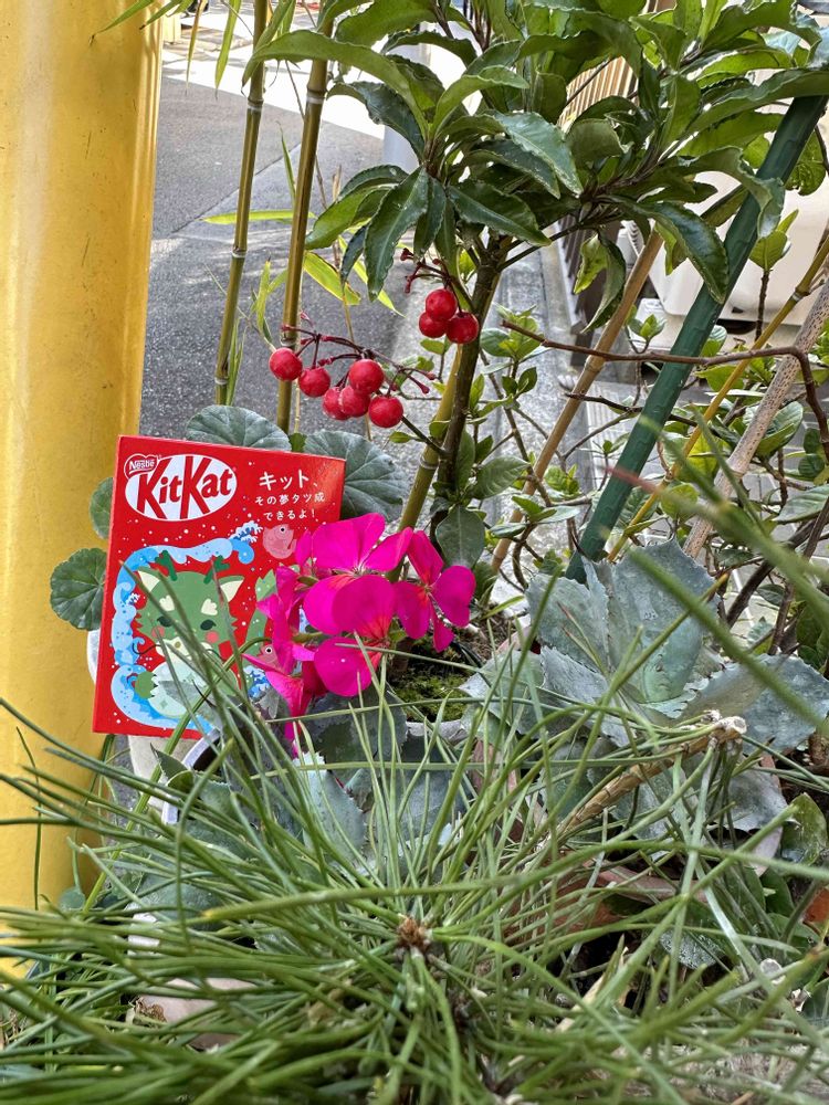 今日のお花の万両です。この鉢には竹、松、梅の代わりにボケがありますが、まだ咲かないのでゼラニウムを置いてます。タツ柄のキットカットと一緒に。今日、成人式で華やかな振り袖の娘さん達を何人か見かけました。おめでとう御座います㊗️希望の年になりますように💕
