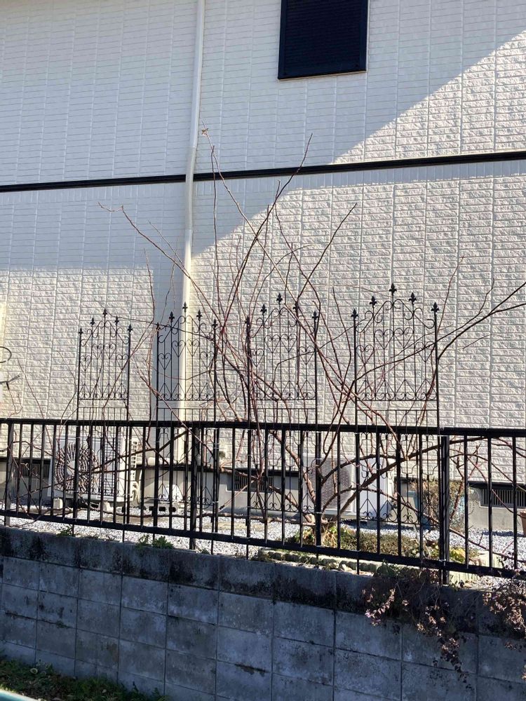 二枚目はロイヤルサンセットのつるが大暴れ。アイアンフェンスを追加設置しました。大暴れのつるを通しながら。反対側は川💦