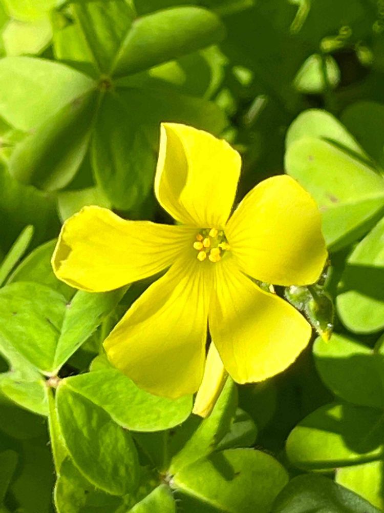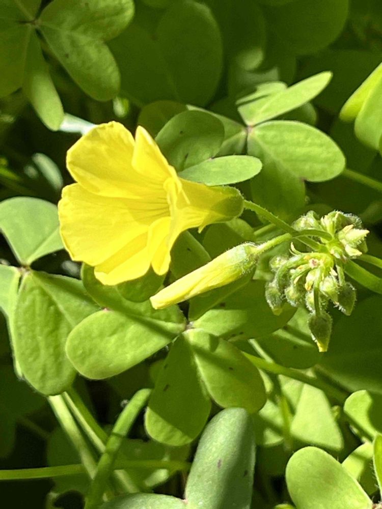 温室の脇、軒下の陽だまりで、オキザリスがいくつか咲き始めました💛💚