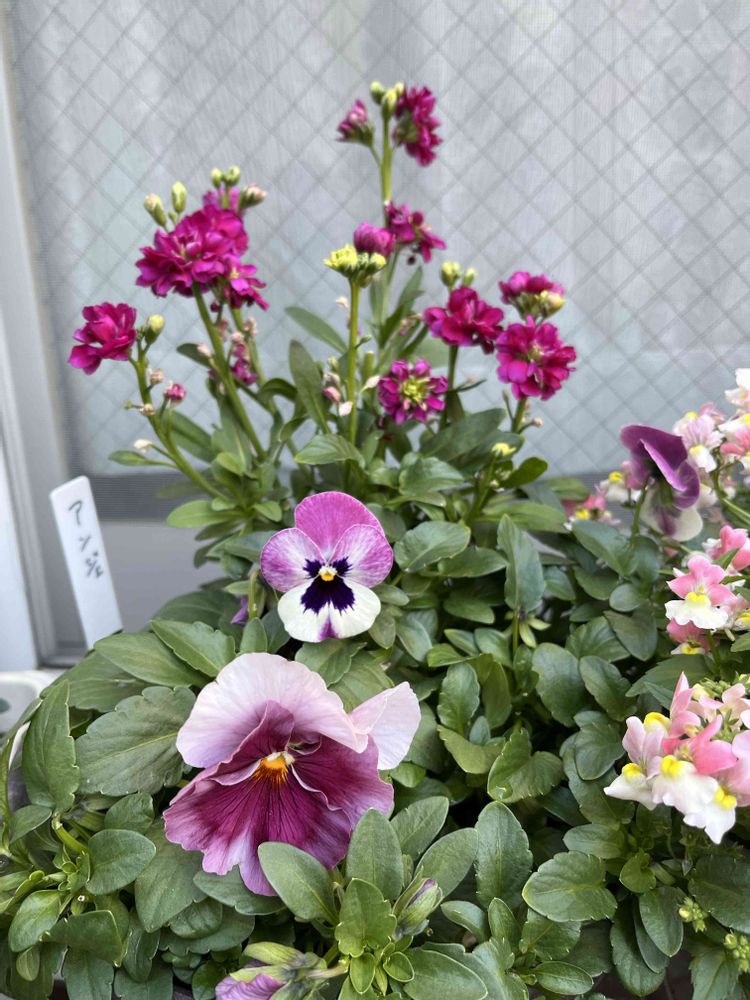 パンジービオラとの同系色寄せ植えしています。
