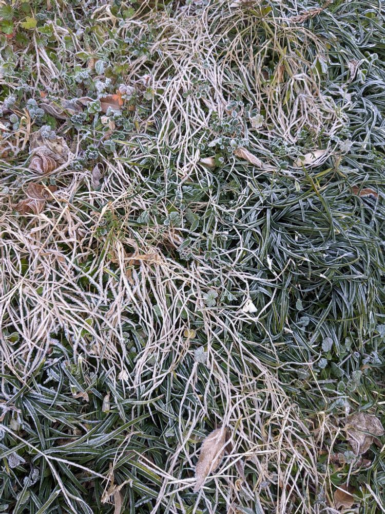 今朝6時、散歩道にて、霜で雪が、降った様に白かった、0℃