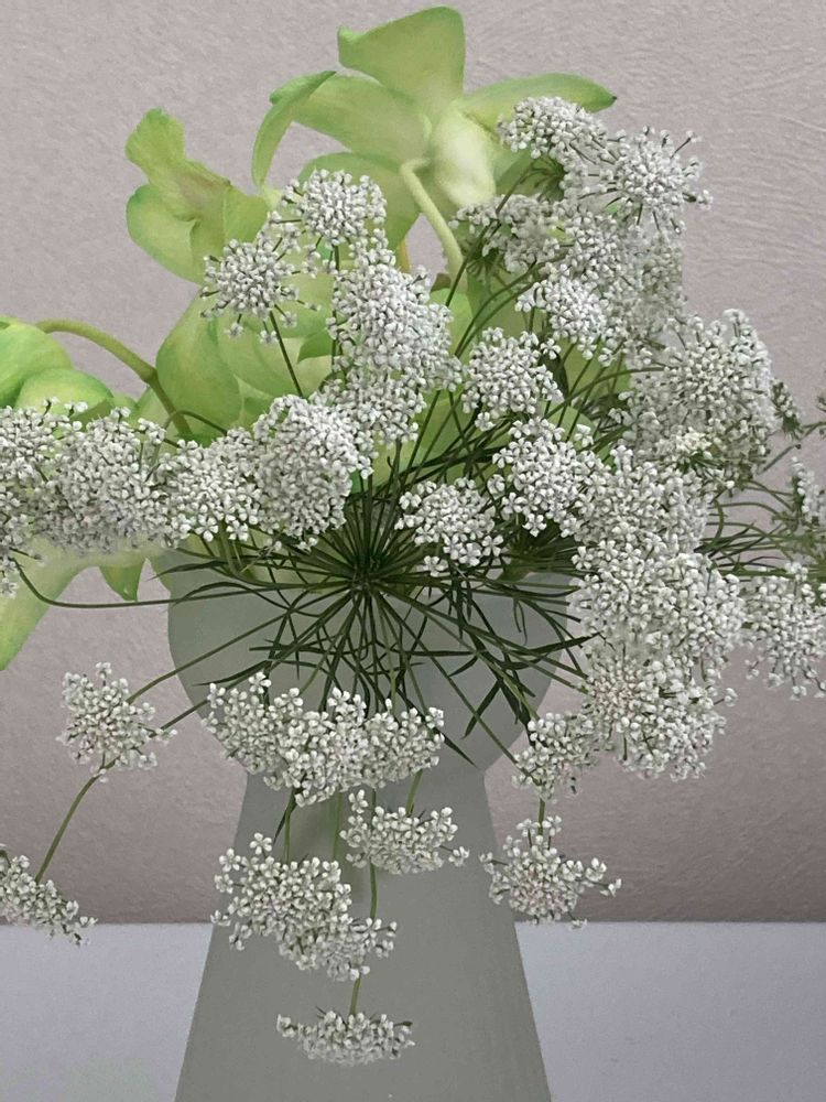 レースフラワーが一杯でお洒落なアレンジですね🤍💚