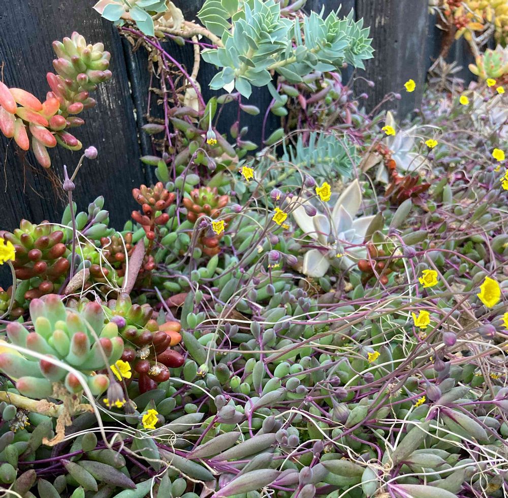 また登場我が家の軒下地植え花壇、一枚目は正確にいうと花壇前こぼれ多肉エリア😅花壇できて5年たつと強い子だけ残って行きます…