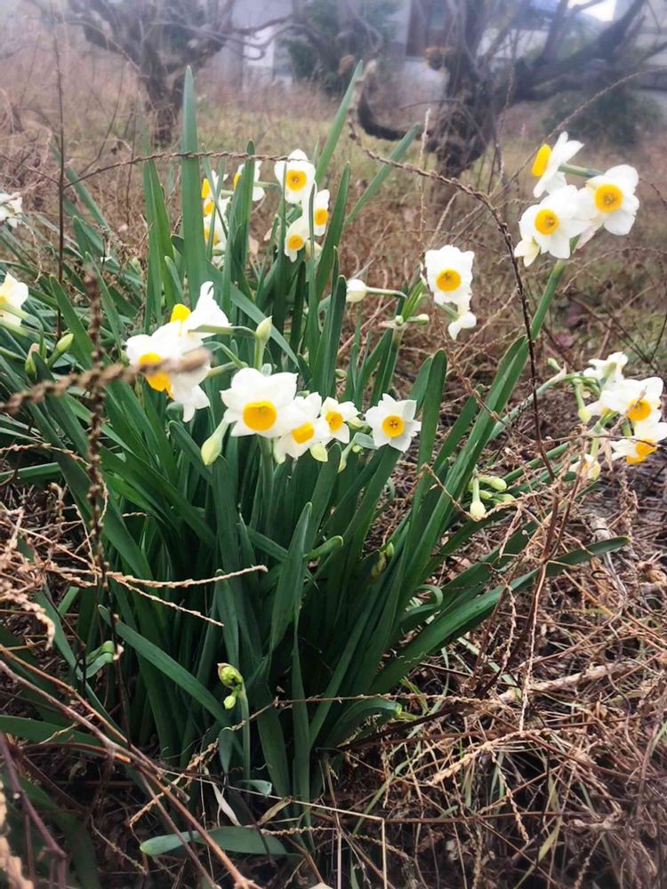 水仙。裏のよそ様の荒地。夏に草刈りしても草刈りしなくても冬に見ると枯れ野原は見た感じ同じ。暑くて苦しい思いしてまで草刈りしなくてもいいのだとゆう事がわかりました⭕️