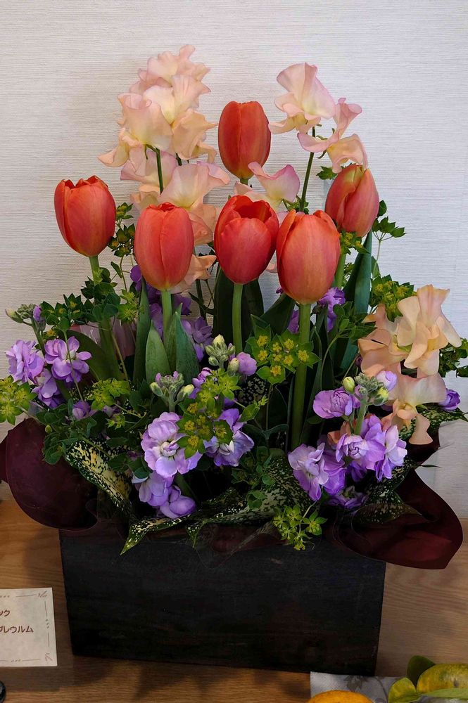 チューリップ、スイートピー、ストック、ゴット、ププレウルムのアレンジメントです。