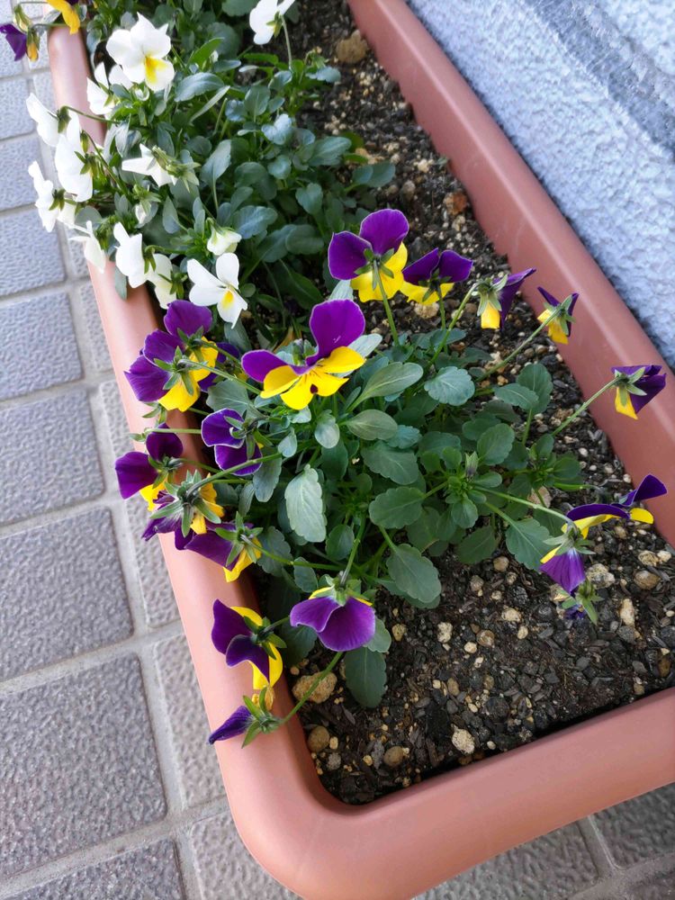 郵便局入口のビオラたちが、