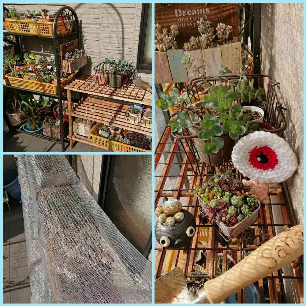 昨日の日曜日、西日ガンガンの軒下多肉棚に遮光カーテンを付けました。
