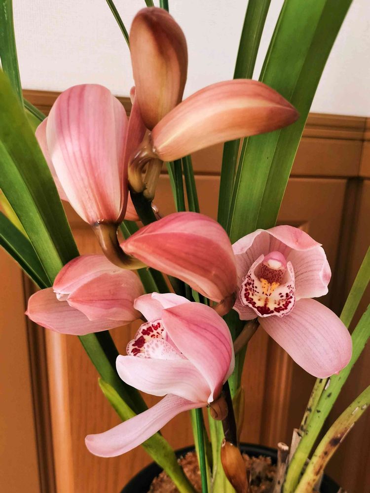シンビジュームだいぶ咲いてきました。蕾がほどけてしまえば結構そこからは早いみたいです。花芽の色が緑→ワインレッド→茶色→ベージュピンク→ピンクで開花って感じで、色が変わるのが不思議でした。蕾があっちこっち向いちゃってるけど、そこもまたかわいいです。温かみのあるいい色ですね。