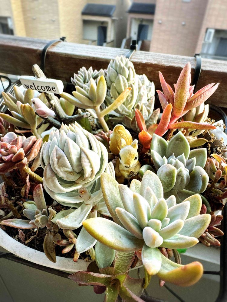 ベランダの多肉ちゃんの寄せ植えも伸び放題です😅