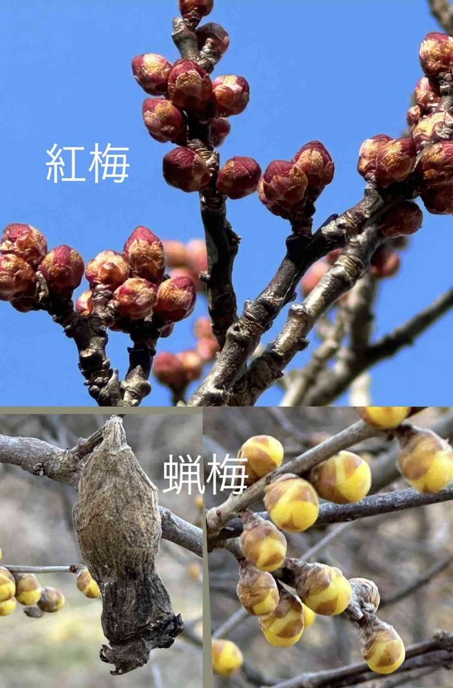 ④近所の蝋梅と紅梅 蝋梅の実がまだ残ってました。
