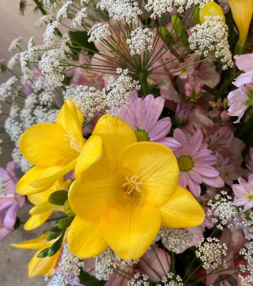おはようございます!自然食のお店に飾ってあったお花です🌼🤍🌸春に開花するフリージアは香りが良く、黄色い華奢な花が特徴的です。