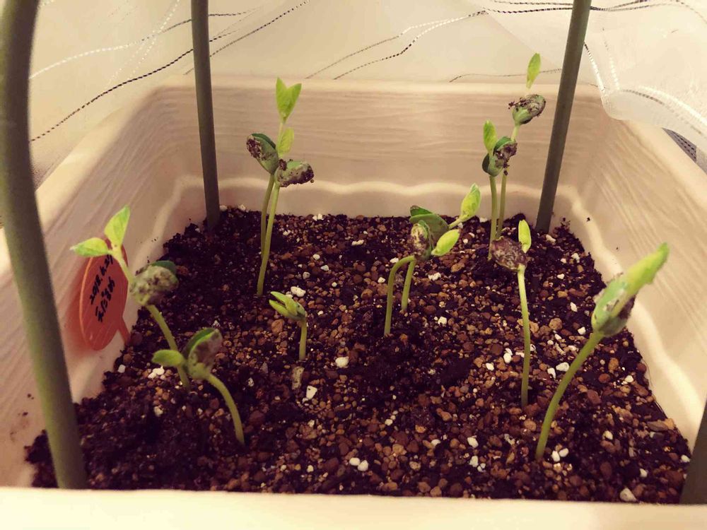 一か所に4粒タネを植えましたが、間引きで一か所2本にしました◡̈
