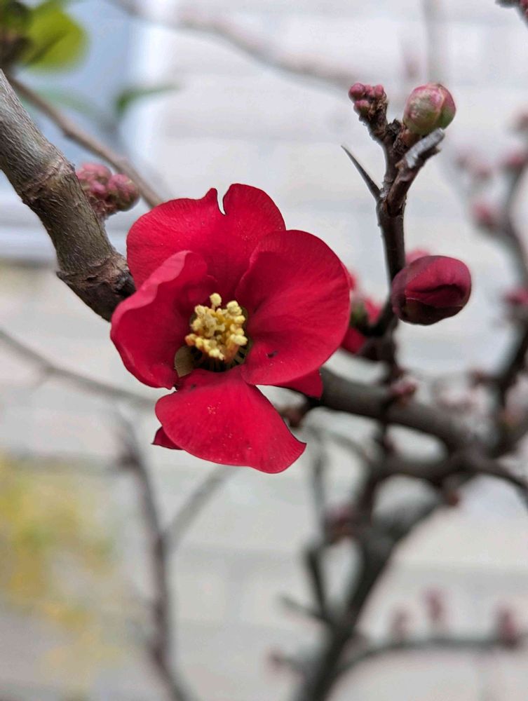 まだ咲き始めたばかりのボケが真っ赤で吸い寄せられました❤️