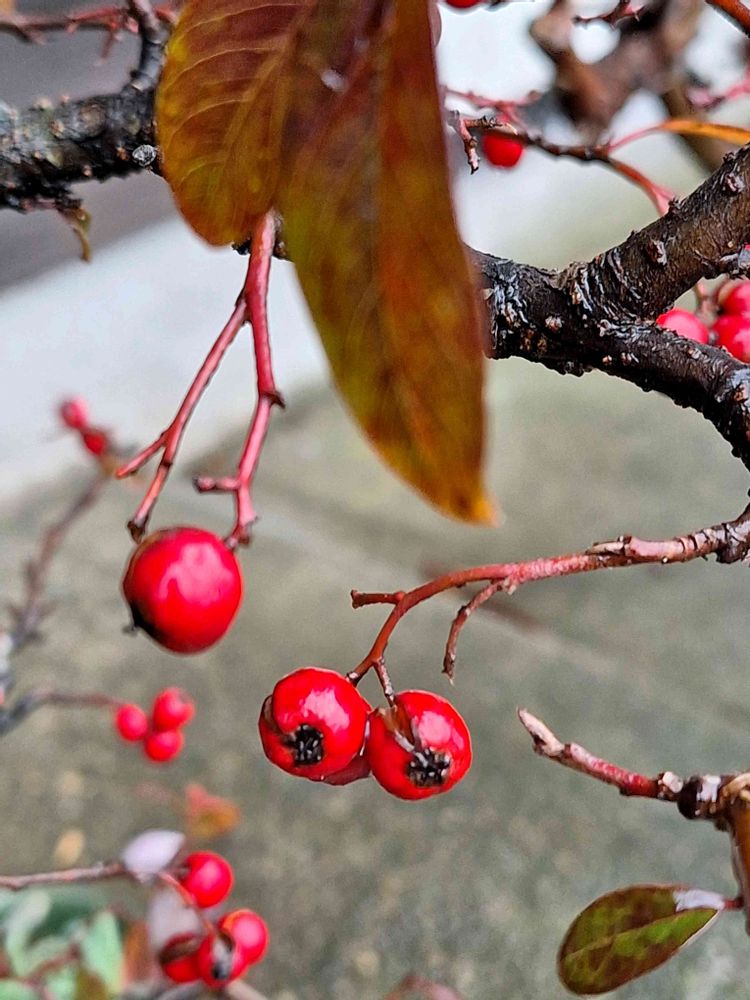 春、白い小花を群生し、実は楕円形で熟すと赤い。