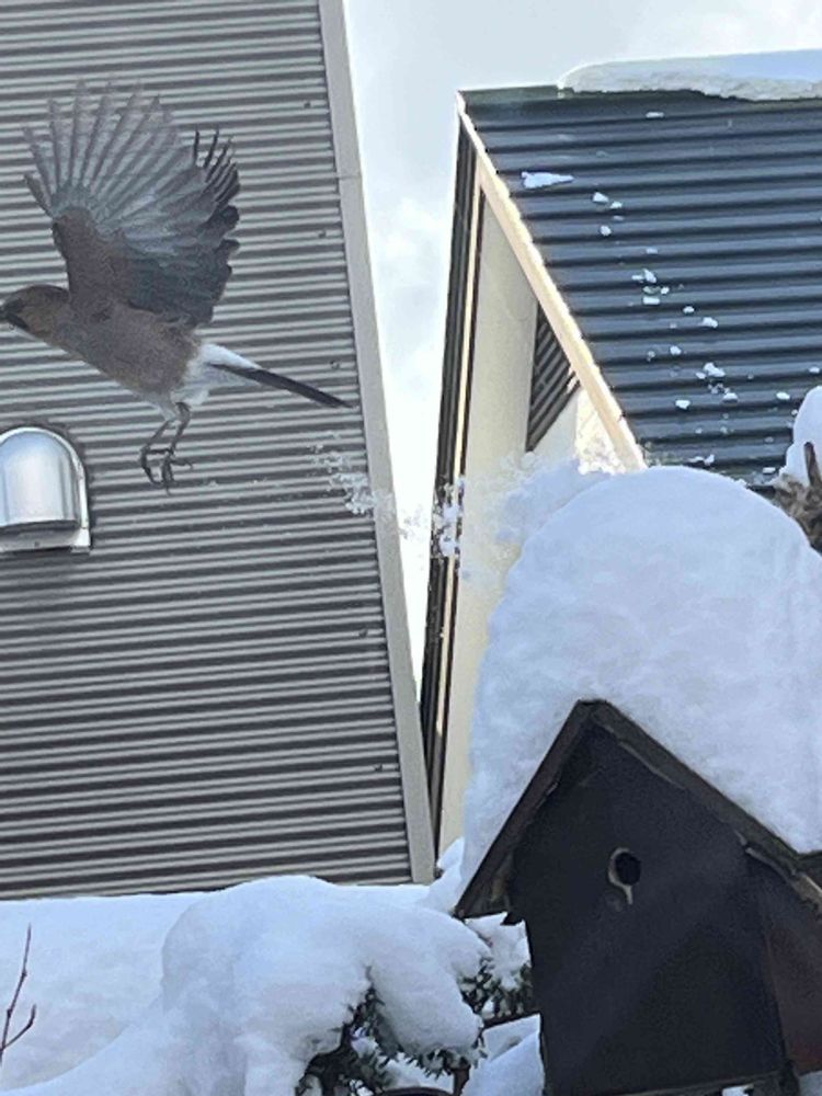 これは初めての鳥でGSさん達からカケスの仲間でミヤマカケスと教えていただきました。今年は雪が少ないと思っていたらやっぱり例年位の積雪になって鳥さん達も山に食べ物が見つからないんでしょうね〜💦