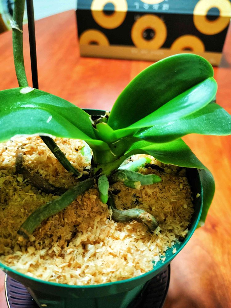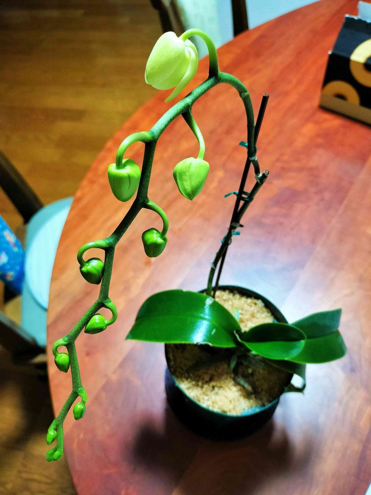 ミディ胡蝶蘭さん、1番早い子が開花を始めました。夏の管理が適当すぎて結構ズタボロなんですが、家の中に入れてから木質ペレット植えにしたのが合っていたのか、加湿器のおかげか、キレイな葉っぱも新しい根っこも出て、蕾も11個もつけてくれてます。蕾を落とさないよう、水やり多めで見守らせてもらいます。