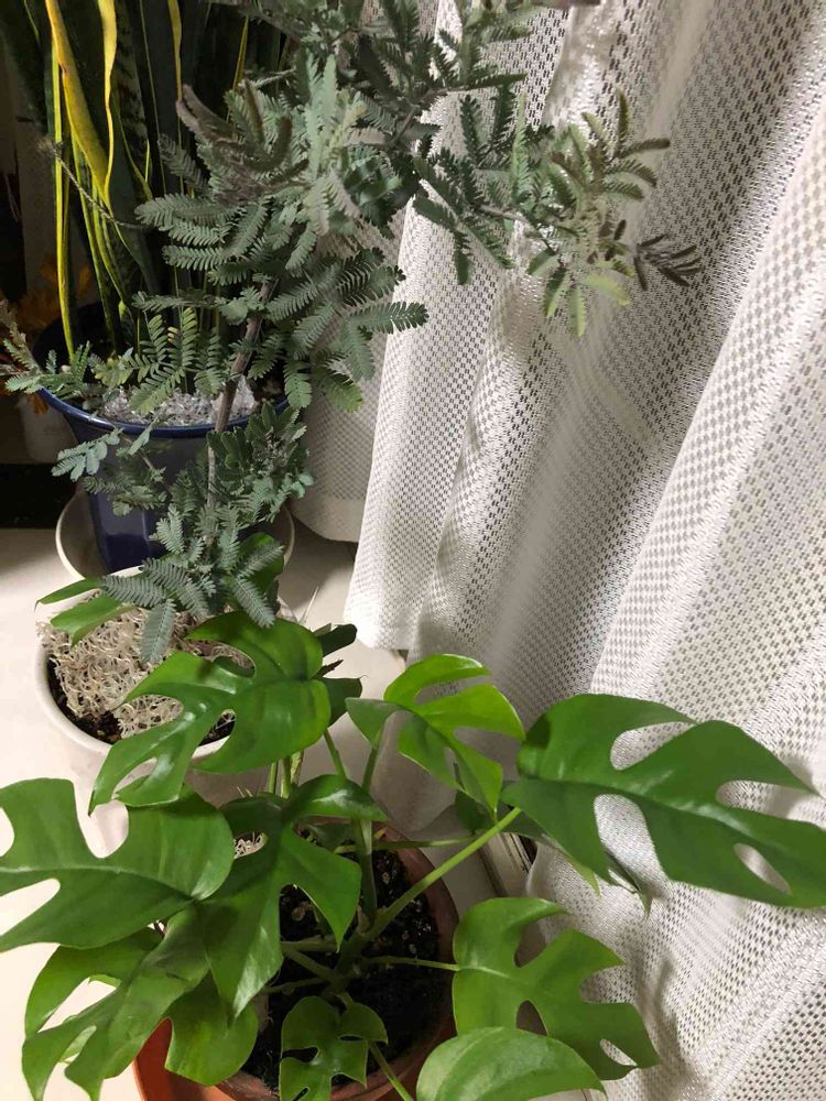 台風💨の接近で、昨日、運命的出会いをした「ゴールデンミモザ プルプレア」と「モンステラ ミニマ」を、部屋の中の出窓に置きました‼️