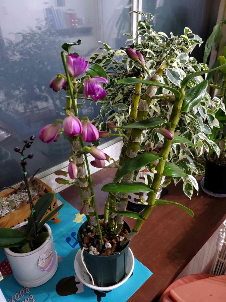 デンドロビウムセカンドラブ🥰少しずつ蕾が開いて、お顔をチラリと見せてくれました☀️バルブのほとんどに花芽が付いてるので、春まで長く楽しめそうです✨