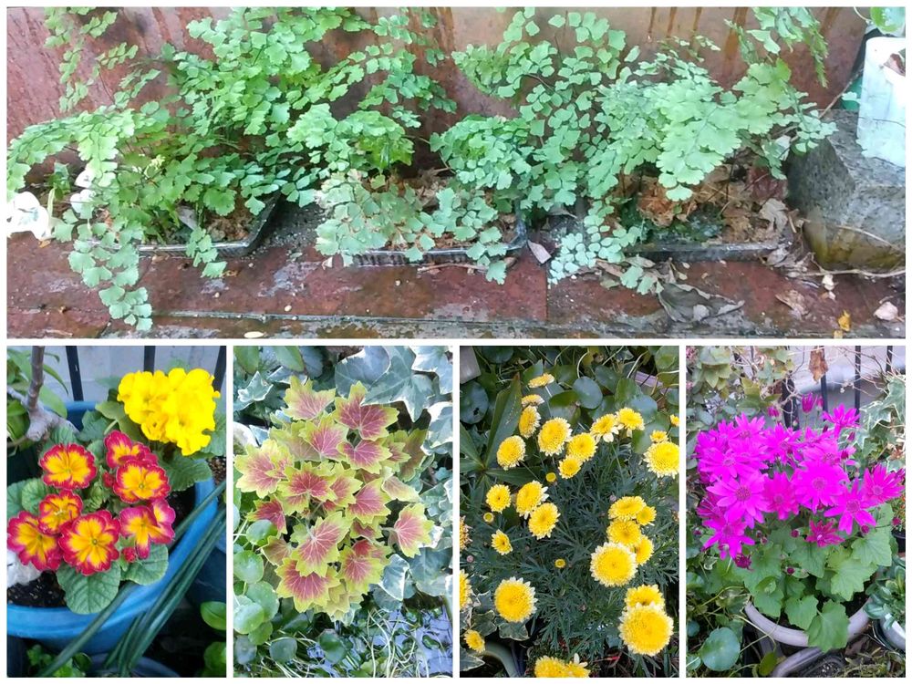 【ごろちゃんの庭のお花達】⬆️アジアンタム↘️から、セネッティ、マーガレット、モミジ葉ゼラニウム、プリムラ、🥰
