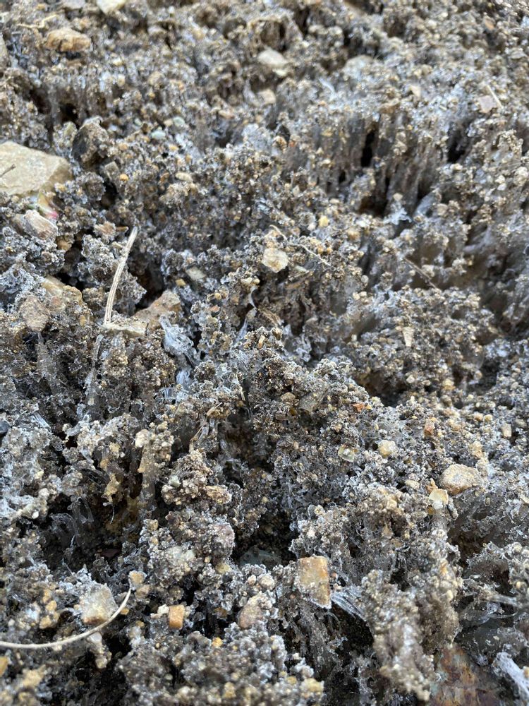 そしてキンキンに冷えた今朝のお庭の霜柱と、そんな中でも元気に咲いてくれてる玄関の門の下の寄せ植え