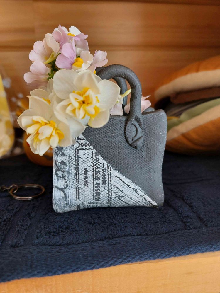 折れたミニ水仙、ネメシアを、可愛いバック型の一輪挿しに・・