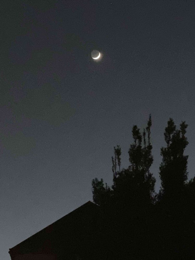 地球照といって三日月🌙の時に現れやすいそうで、地球からの照り返しで三日月の上がほんのり丸く見える様です。
