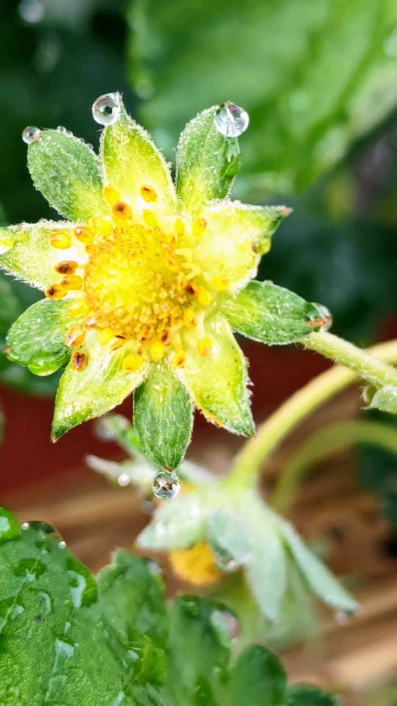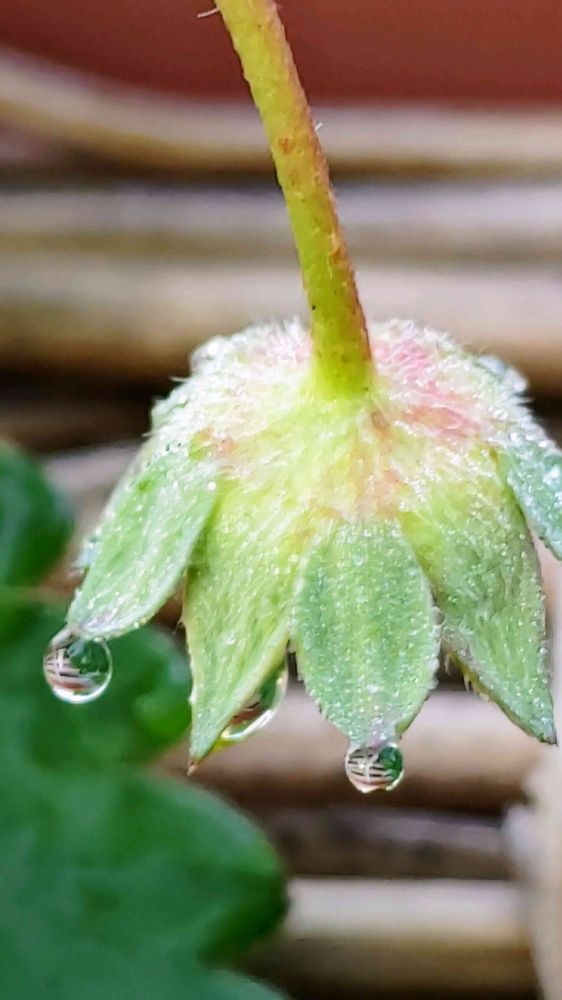 イチゴの花のヘタに着く、キラキラも美しいけど、葉にも、美しい露玉がつくんだよ。