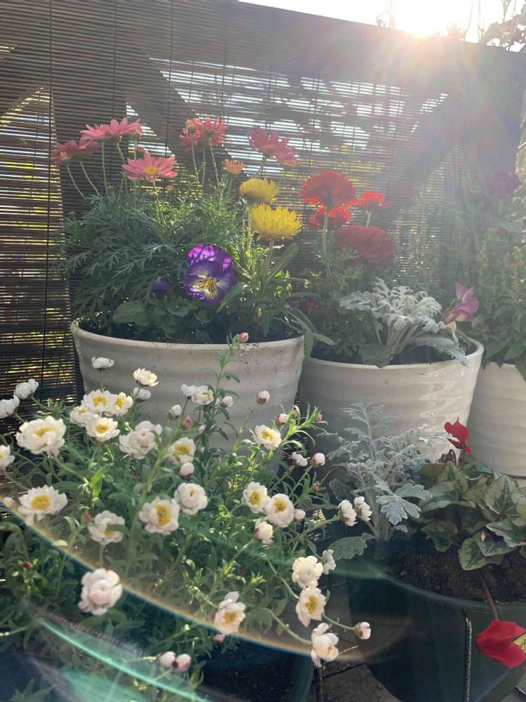 タネから育てた虹色スミレを何とか寄せ植えに。