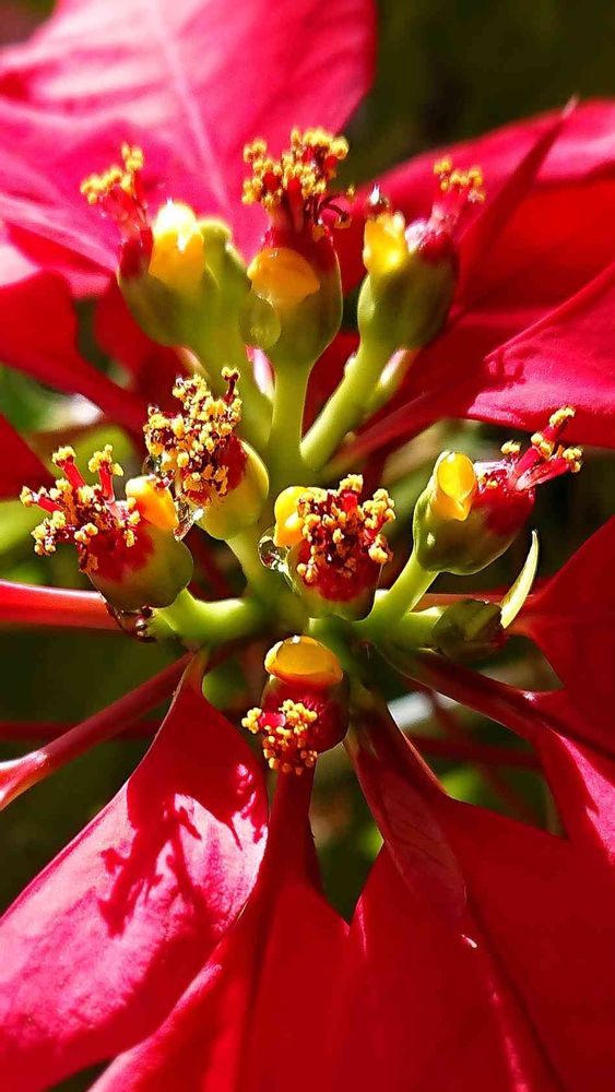 赤い苞(ほう)と言われるのは葉で、このつぶつぶしたところがポインセチアさんのお花🌼