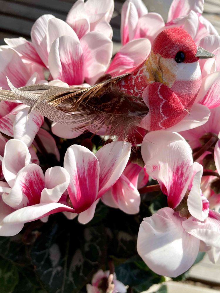 あっ、ピンクのインコ🦜がいる〜ってシクラメンの上にお座りさせてみたら。