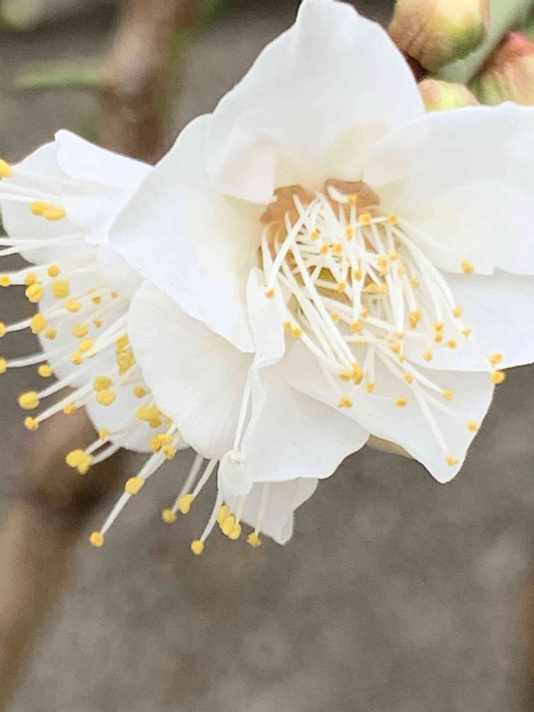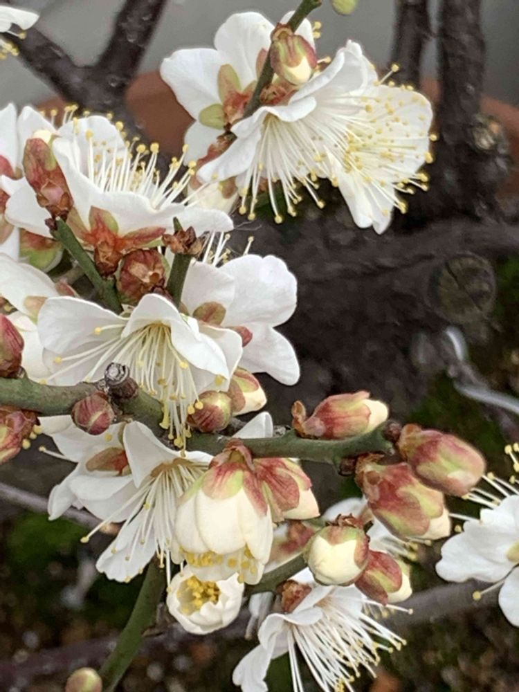 梅の花の下にイチゴの花が🌼一輪咲いていました。
