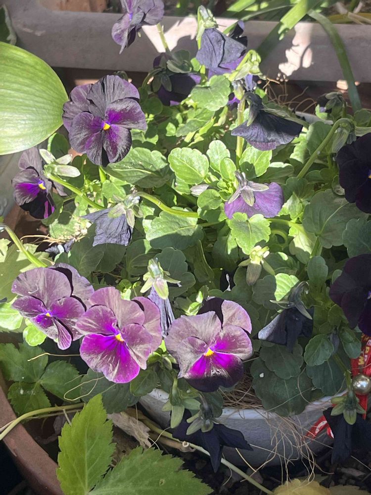 ♡太陽☀️が当たっているビオラと日影のビオラ両方とも同じビオラなのにこんなに色が違って👀見えます。
