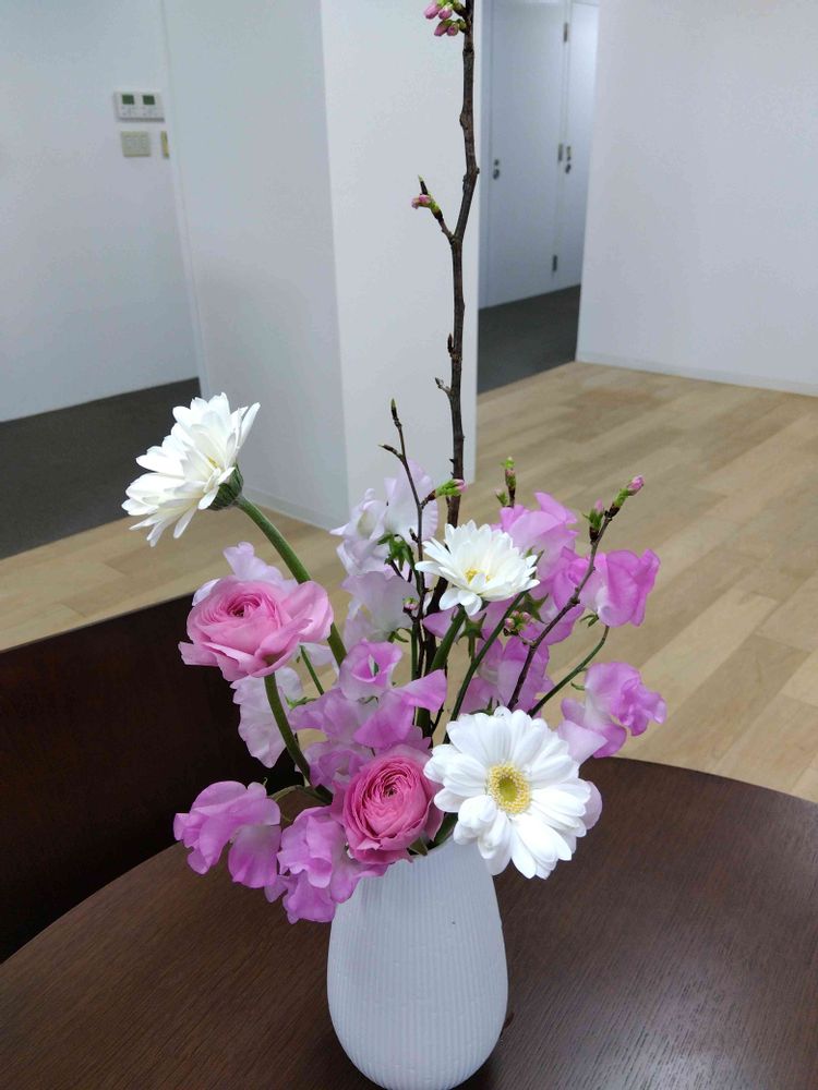 今回はピンク基調にかなり甘めにしました😅白のガーベラを入れてスッキリ目に調整。まだ寒いですが春のお花で明るくしたいですね💐
