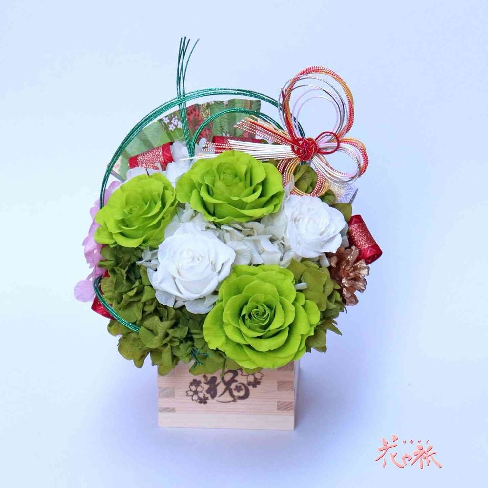 画像は緑色の薔薇(プリザーブドフラワー)が爽やかに咲く枡フラワーです💚