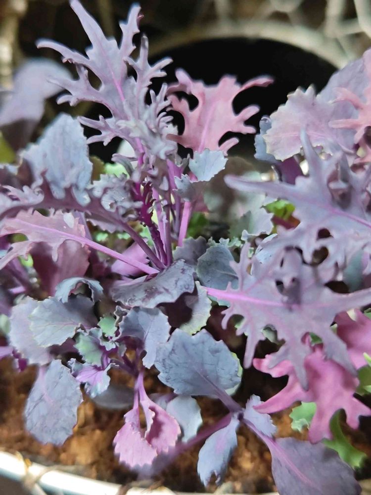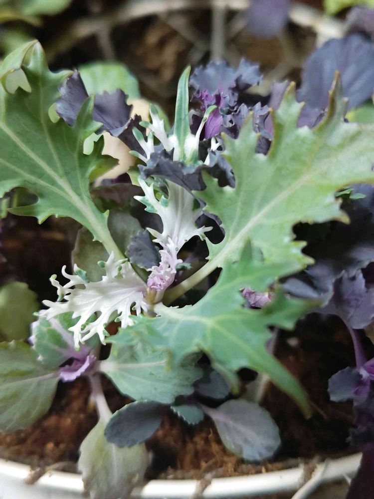 4枚め、お散歩ちゃんと背比べ。葉牡丹の高さは7cm前後。葉牡丹特有の葉っぱに白い粉(ブルーム)がかぶったような赤紫。緑の中心に白い部分もできてきました。(2024/1/16撮影)